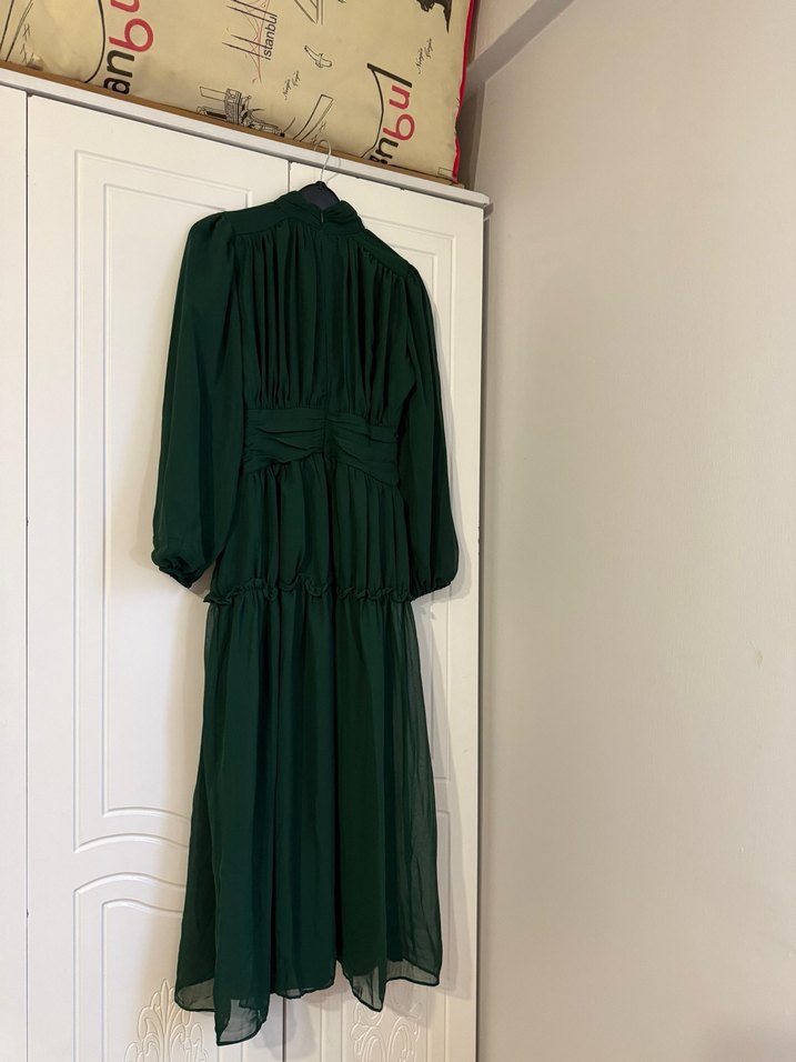 Yüksek yakalı, drapeli ve uzun kollu koyu yeşil uzun elbise. Rahat kesimli ve sentetik, pürüzsüz kumaştan, ofis için uygun.