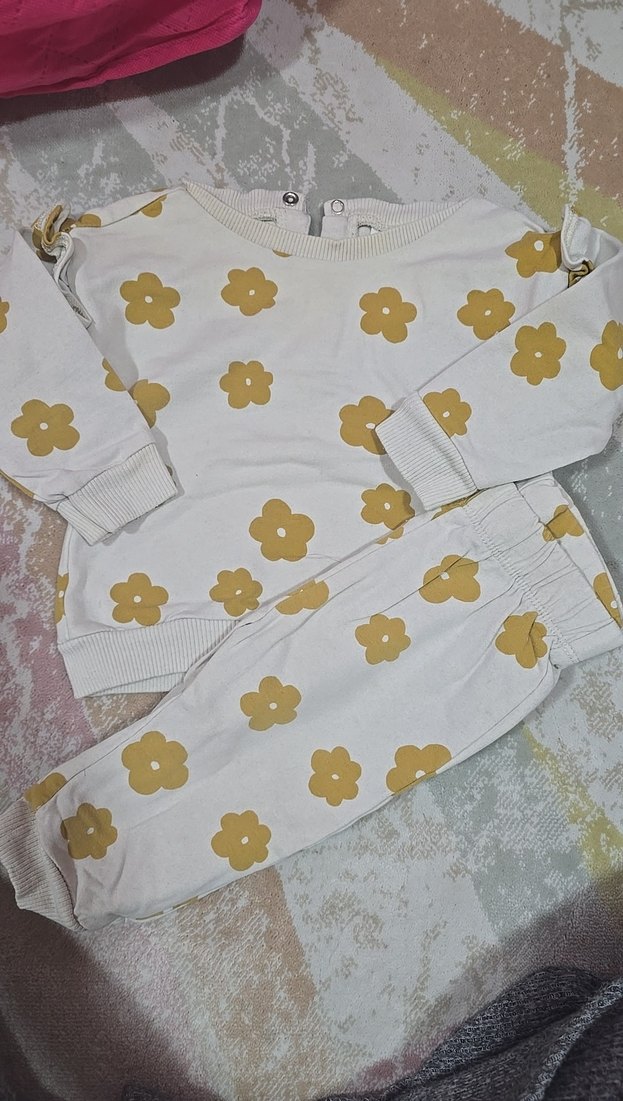 Uzun kollu, pastel beyaz zemin üzerine sarı çiçek desenli bebek kız takımı. Dantel detayları ve yumuşak, rahat kumaş içerir.