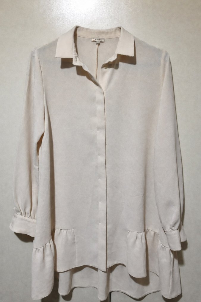 Bol kesim, krem keten gömlek, yakalı ve düğmeli. Uzun kollu, midi boy, pastel tonlarda, ofis ve günlük kullanıma uygun.