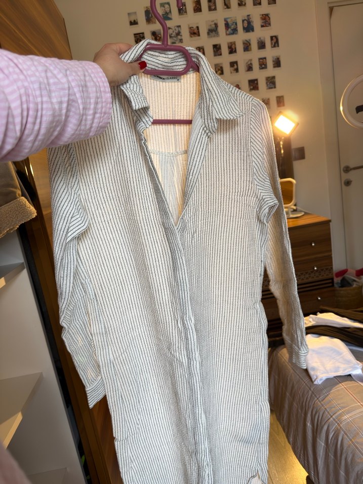 Gri çizgili keten midi gömlek, bol kesim, uzun kollu, yakalı ve düğmeli detaylara sahip, bohem Paris tarzını yansıtıyor.