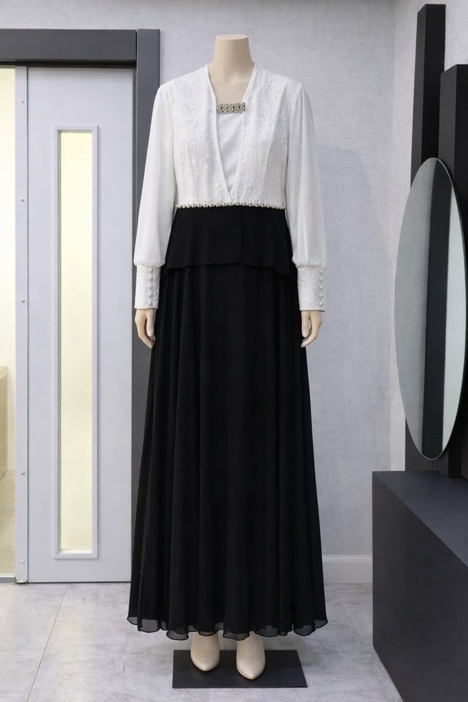Uzun Kollu Krem-Siyah Abiye(Alvina)