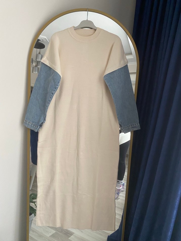Uzun Kollu krem Triko Elbise ve Kot Kollu