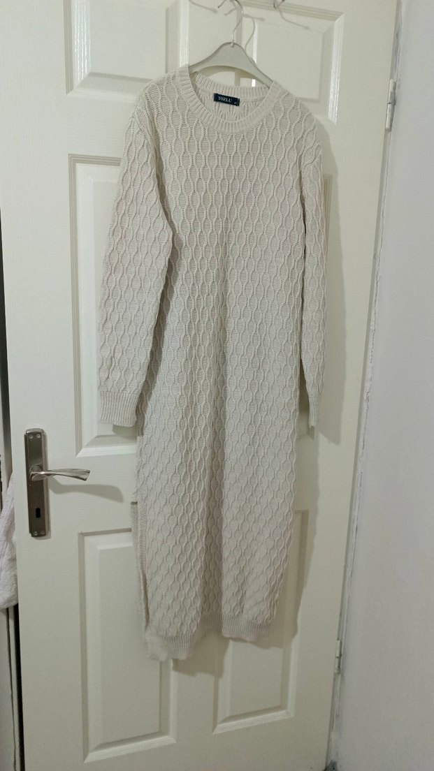 Krem tonlarda, uzun kollu, triko örgü dokusuna sahip, rahat kesimli kadın elbisesi. Crew yaka ve gündelik sokak stiline uygun.