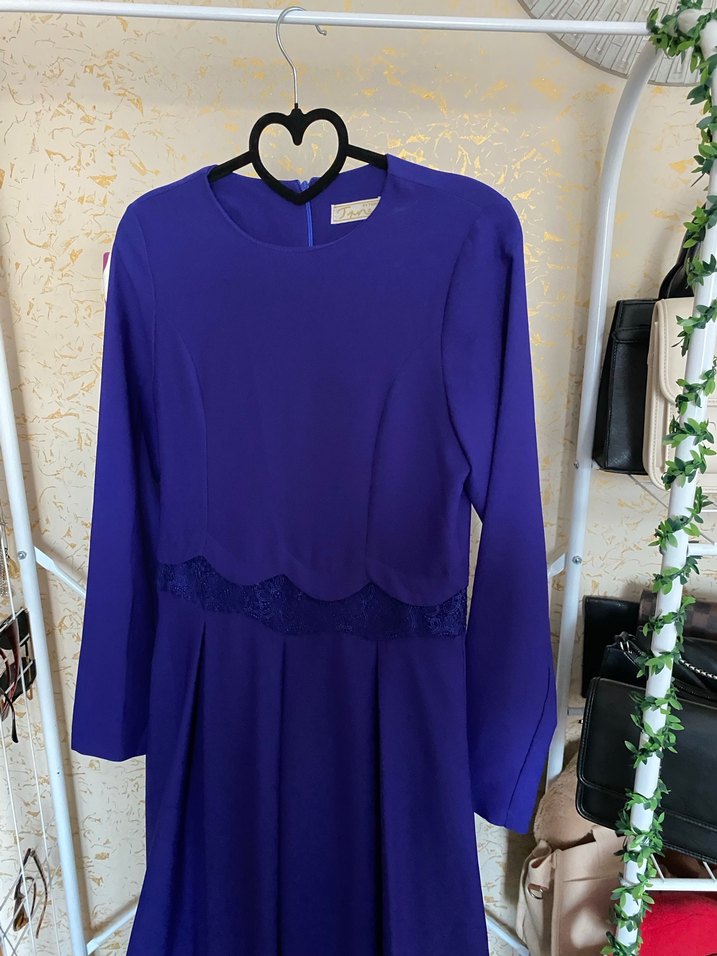 Uzun kollu, krep kumaştan yapılmış, dantel işlemeli ve klasik kesime sahip mavi uzun abiye. Düğünler için uygundur. Herhangi bir deformasyonu hasarı yoktur