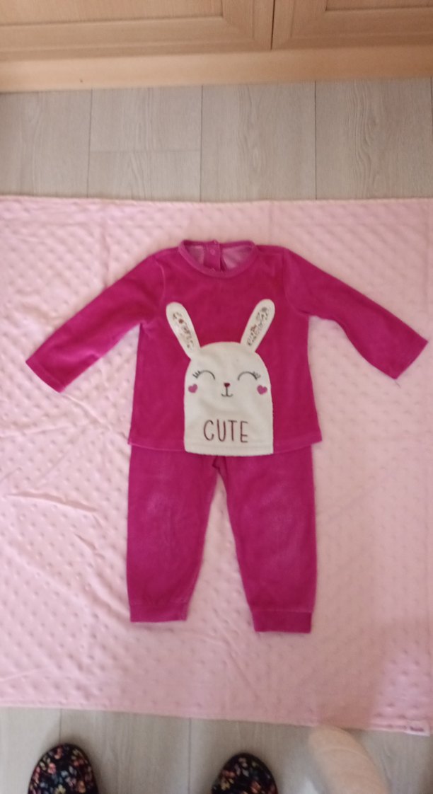Uzun kollu, kürklü ve renkli baskılı detaylara sahip bebek kız kıyafet seti. Üstte "CUTE" yazılı sevimli tavşan deseni bulunur. Yumuşak ve rahat kadife kumaş.