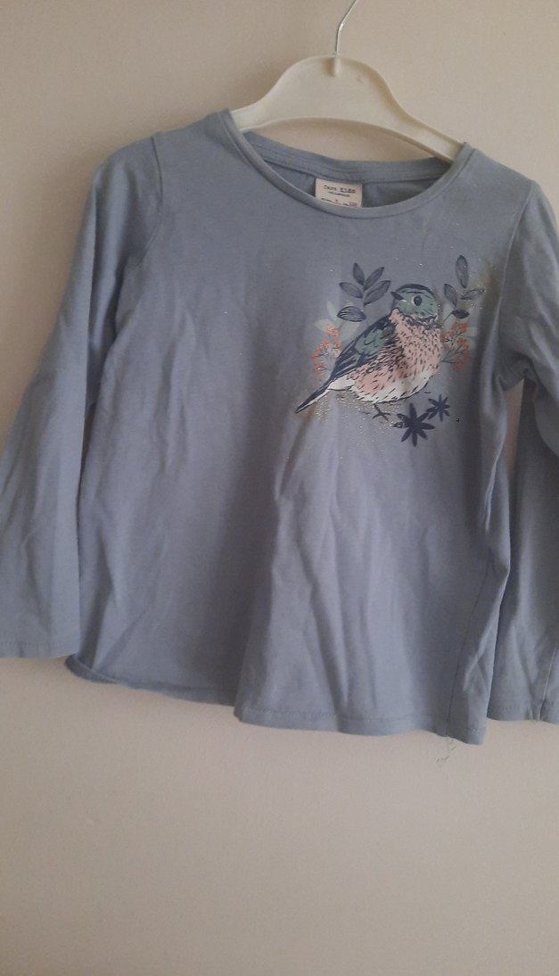 Pamuklu, uzun kollu, yuvarlak yakalı, kuş baskılı, düğmeli, bol kesim gri kız tişörtü.