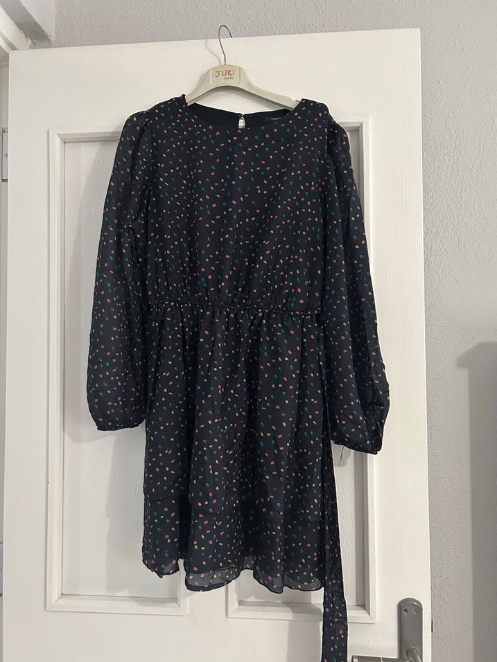 Bohem tarzda, uzun kollu ve bisiklet yaka midi elbise. Yumuşak sentetik kumaştan, kuşaklı ve bol kesim. Koyu renkli, çok renkli batik desenli. Günlük kullanım için uygun.