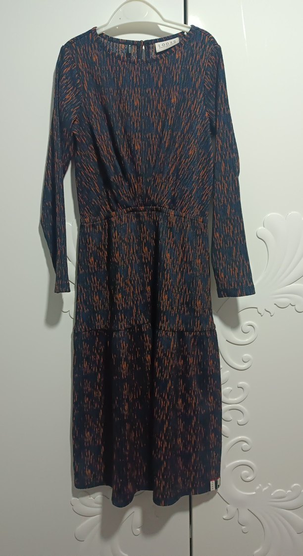 Kız çocuklari için uzun, yüksek yakalı ve uzun kollu, bol kesim elbise. Piliseli tasarım ve lacivert batik desenli, bohem tarzını yansıtıyor. Günlük kullanım için uygundur.