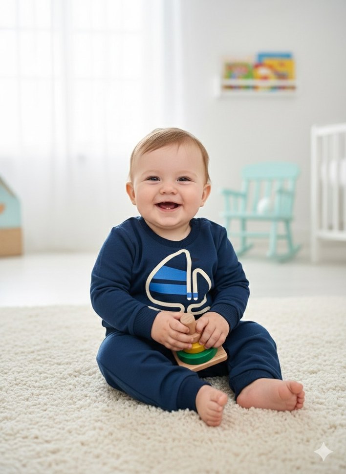 Uzun kollu, düğmeli ve yuvarlak yaka bebek body, yumuşak ve sıcak kumaştan, sade lacivert renkte üretilmiştir.