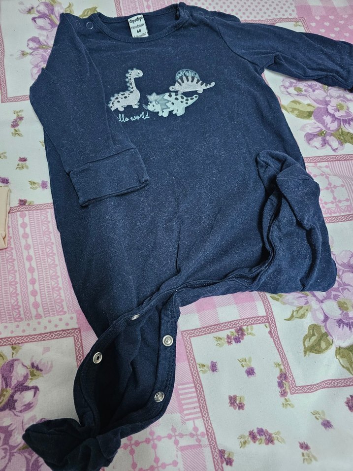 Uzun kollu, kaplumbağa yaka ve düğmeli lacivert bebek tulumu. Yumuşak, sıcak kumaştan yapılmıştır ve sevimli dinozor baskısına sahiptir.