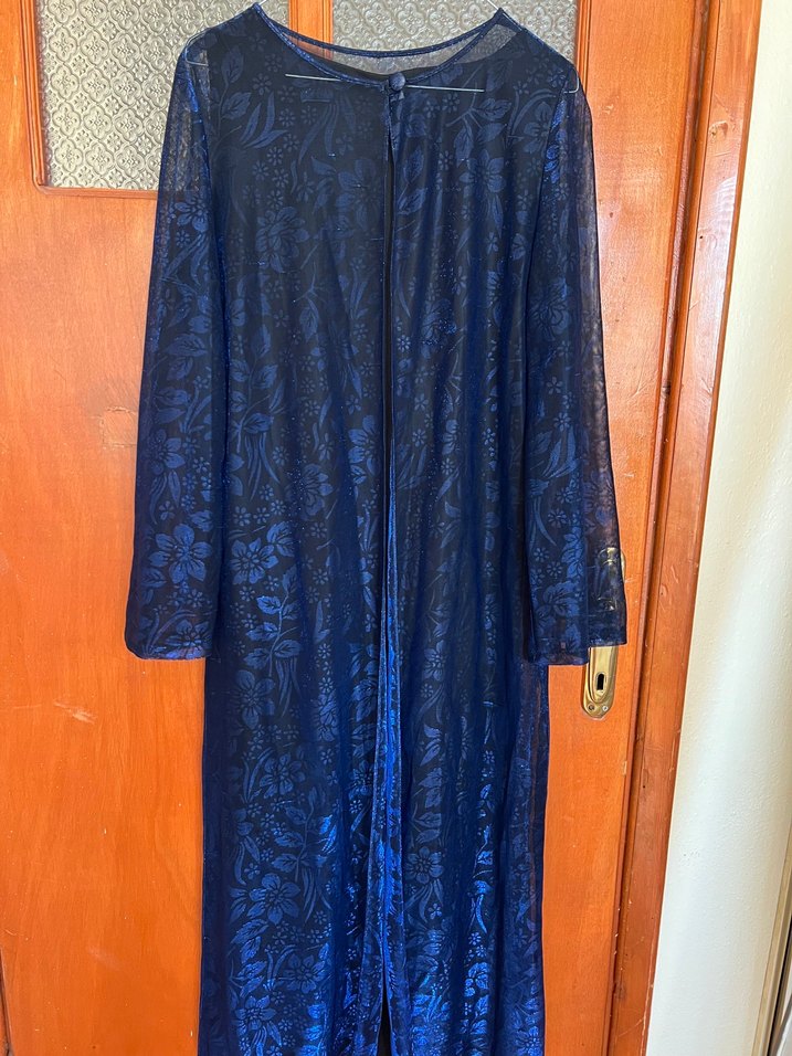 Kadınlar için uzun, bol kesim, uzun kollu lacivert desenli kumaştan yapılmış bohem ve gotik tarzda elbise. Uzun boyuyla dikkat çeker.