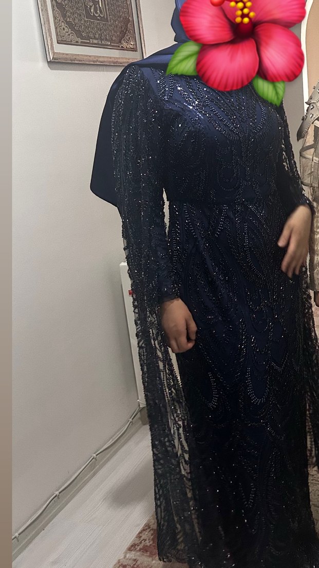 Lacivert uzun kollu pelerinli abiye elbise, yüksek yakalı ve boncuk işlemeli detaylara sahip. Düzenli kesimi ve mütevazı, göz alıcı bohem tarzıyla parti için uygundur. ✨