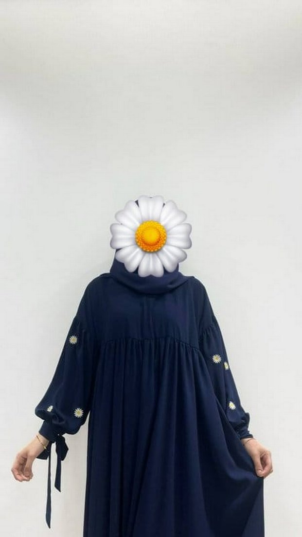 Lacivert uzun elbise, yüksek yakalı ve salaş kesimdir. Çiçek desenli uzun kollara ve drapeli detaylara sahiptir. Günlük kullanıma uygundur. standart bedendir,kumaşı Medine ipeğidir.Sayili kullanildi ,şal dahil değildir .