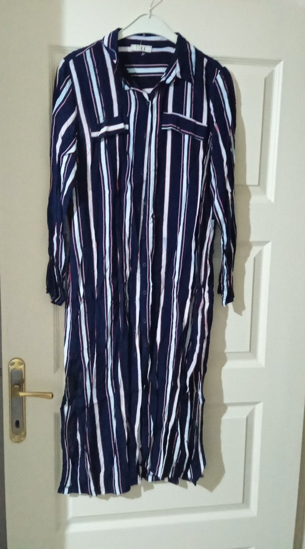 Uzun, bol kesim kadın elbise, ve uzun kollara sahiptir. Lacivert çizgili deseni ve yakalı tasarımıyla sentetik kumaştan üretilmiştir.