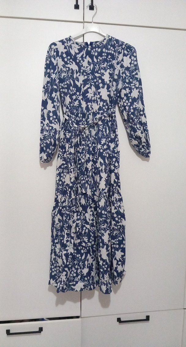 Lacivert ve gri çiçek desenli, uzun kollu, yüksek yakalı ve kemerli rahat kesim uzun elbise. Yumuşak sentetik kumaştan, günlük kullanım için uygun bohem tarzda.