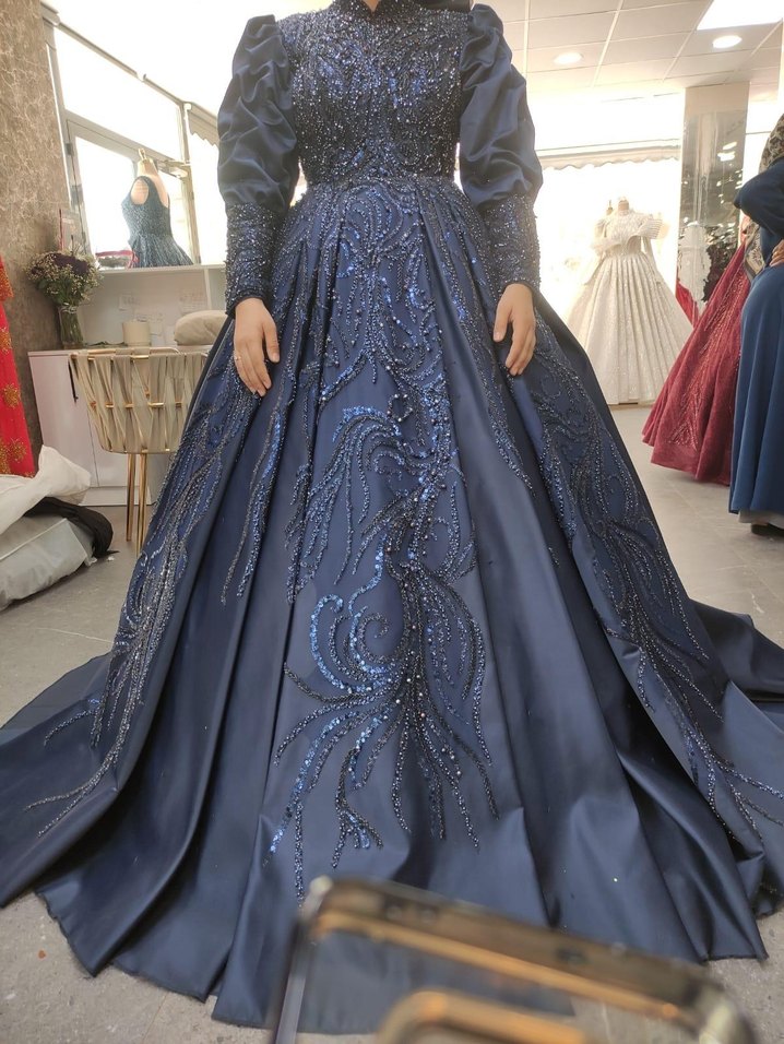 Bu dar kesim nişan elbisesi, yüksek yakalı ve uzun kolludur. Lacivert kumaş, göz alıcı desenli işlemelerle süslenmiş, gösterişli bir düğün görünümü sunar.