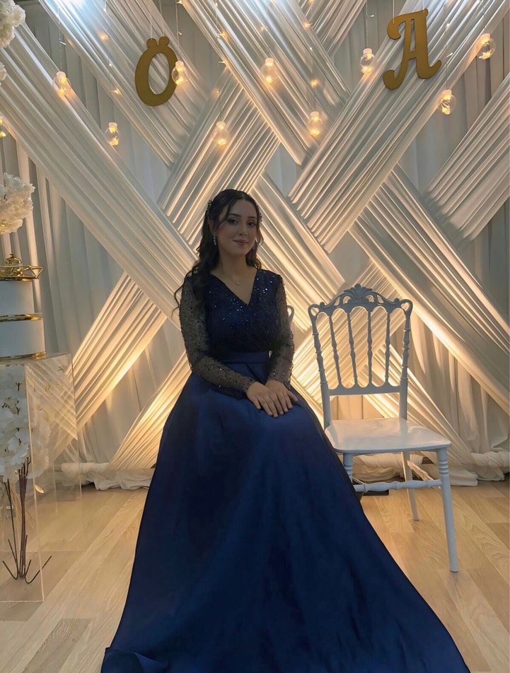 Uzun Kollu Lacivert Drapeli Abiye Elbise