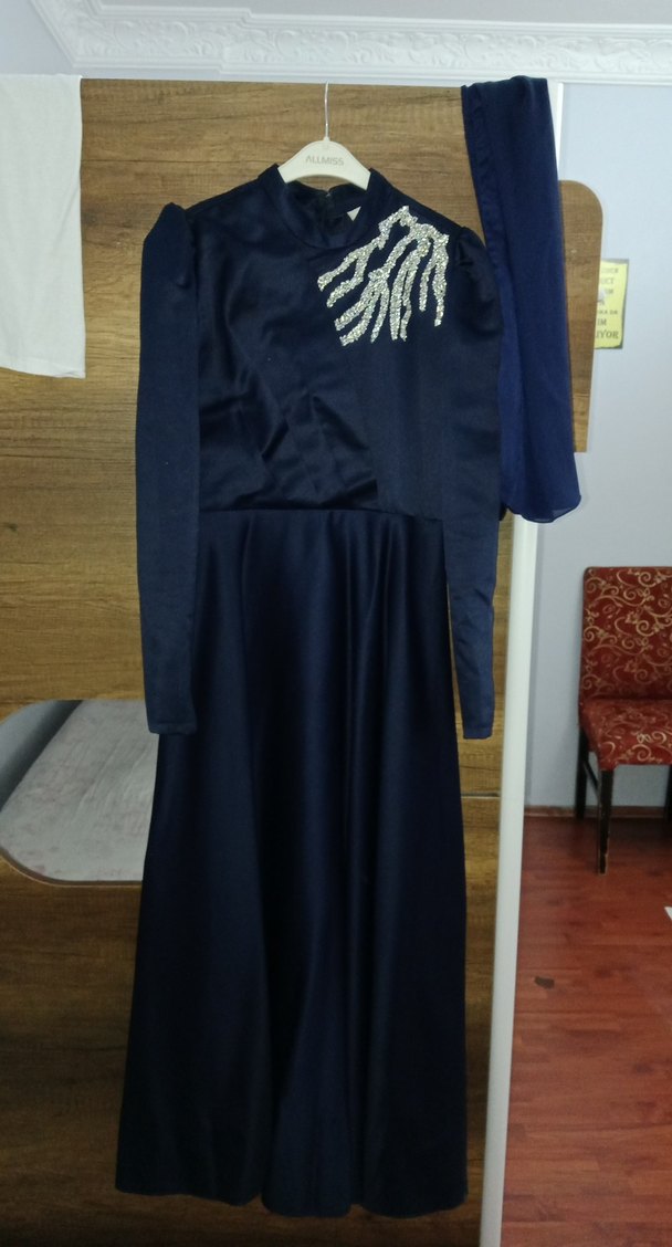Bu lacivert uzun abiye elbise, yüksek yakalı ve uzun kolludur. Drapeli tasarımı ve omuzdaki avant-garde iskelet el detayı ile sade ve şıktır. Düğünler için uygundur. 38 beden dir 1 defa giyilmiş indirim vardır