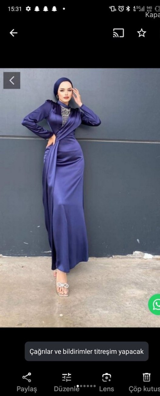 Uzun kollu, V yaka ve drapeli tasarıma sahip lacivert taşlı abiye elbise. Düzenli kesim ve parlak kumaşıyla düğün ve özel günler için uygundur. ✨