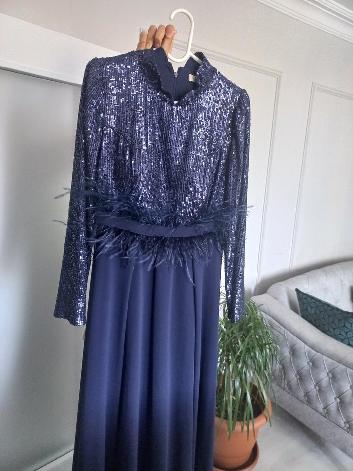 Uzun kollu, yüksek yakalı lacivert abiye elbise. Üst kısmı payetli ve tüy detaylı, drapeli ve bol kesimli, şık ve gösterişli bir tasarım. ✨