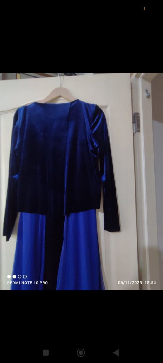 Uzun, koyu mavi renkteki bu kadın elbisesi drapeli tasarıma, V yaka ve uzun kollara sahiptir. Düzenli kesimiyle çağdaş ve Parisli tarzını yansıtır. Ofis kullanımı için uygundur.