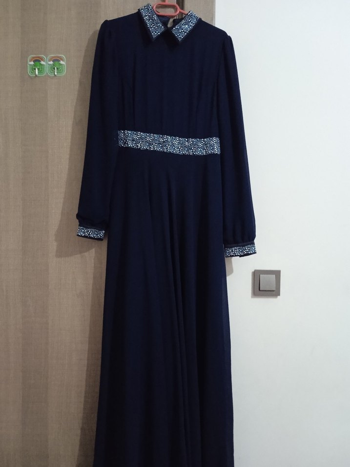 Lacivert uzun kol ve yüksek yakalı, düzenli kesim kadın elbisesi. Drapeli detaylar ve yakada, belde, kollarda süslemeler bulunur. Ofis kullanımı için uygundur.