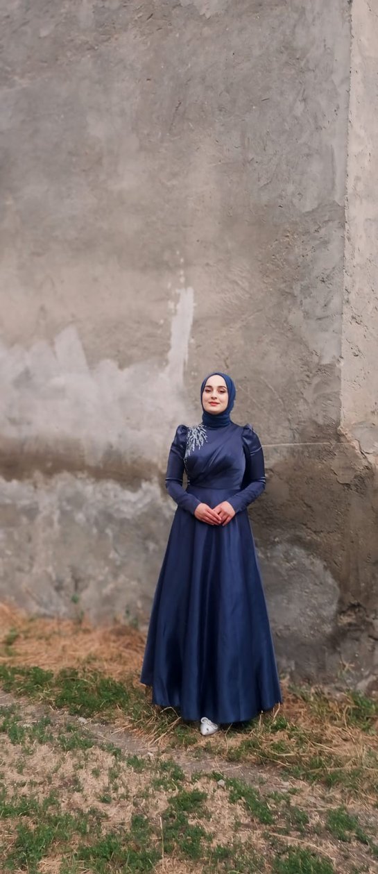 Lacivert uzun kollu, yüksek yakalı ve etnik desenli drapeli tesettür abiye. Düğünler için uygun, rahat kesim ve sade şık tasarım.