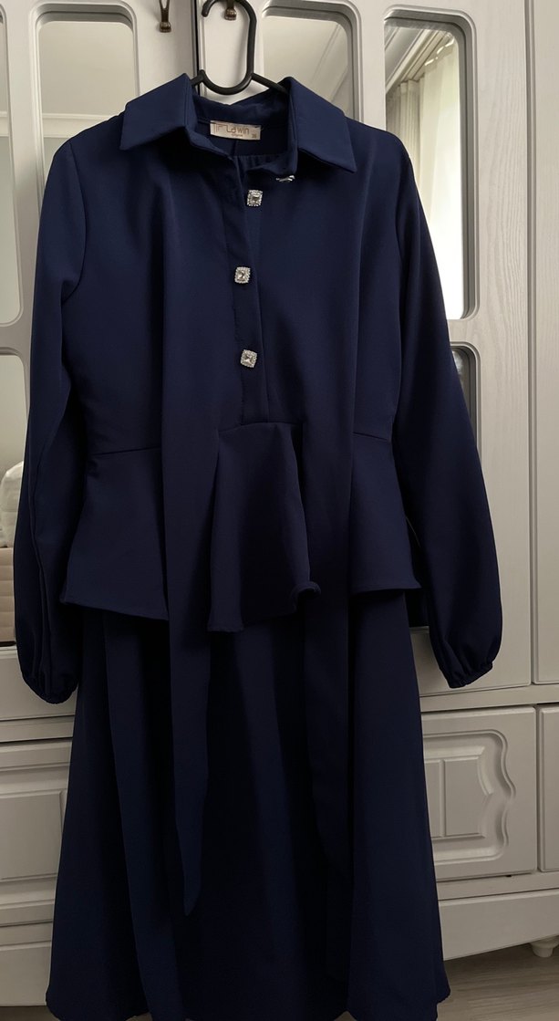 Uzun Kollu Lacivert Düğmeli etekli takım