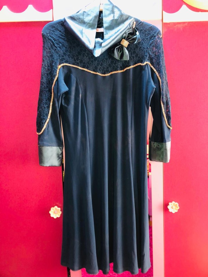 Uzun kollu, dantel detaylı ve yakalı bu lacivert elbise, drapeli tasarımıyla gotik ve şık bir görünüm sunar. Parti için uygun.