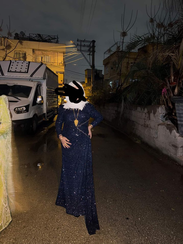 Fıt kesim uzun kollu, yüksek yakalı lacivert abiye elbise, etnik desenlerle süslenmiş. Drapeli ve modest gotik tarzda, düğünler için uygun.
