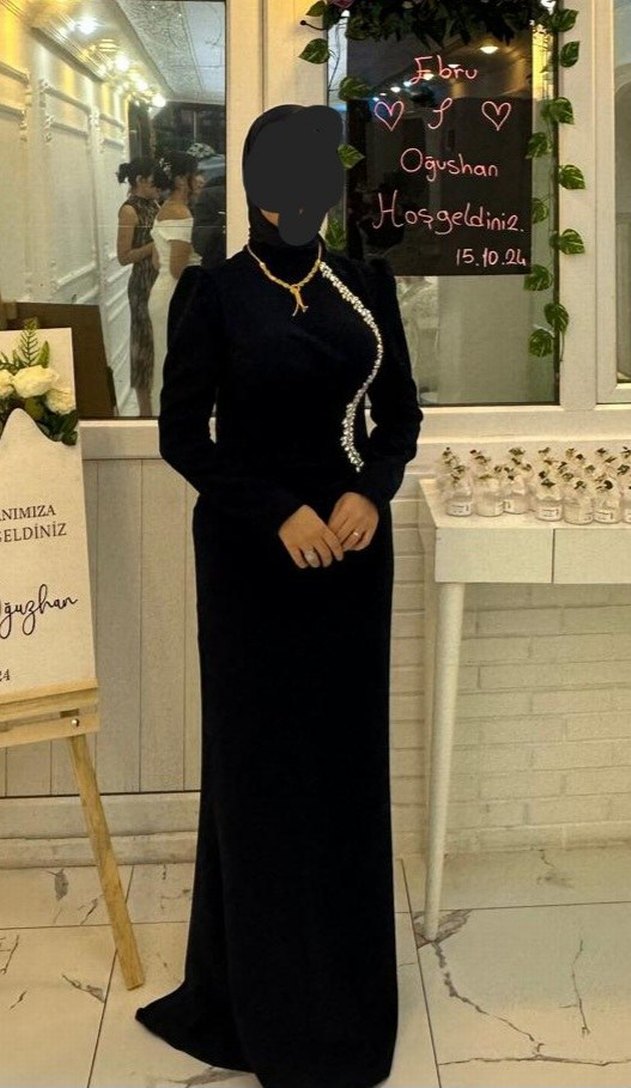 Uzun kollu, yüksek yakalı ve drapeli detaylara sahip lacivert vücuda oturan gotik tarzda abiye elbise. Düğün için uygun.2 kez giyildi