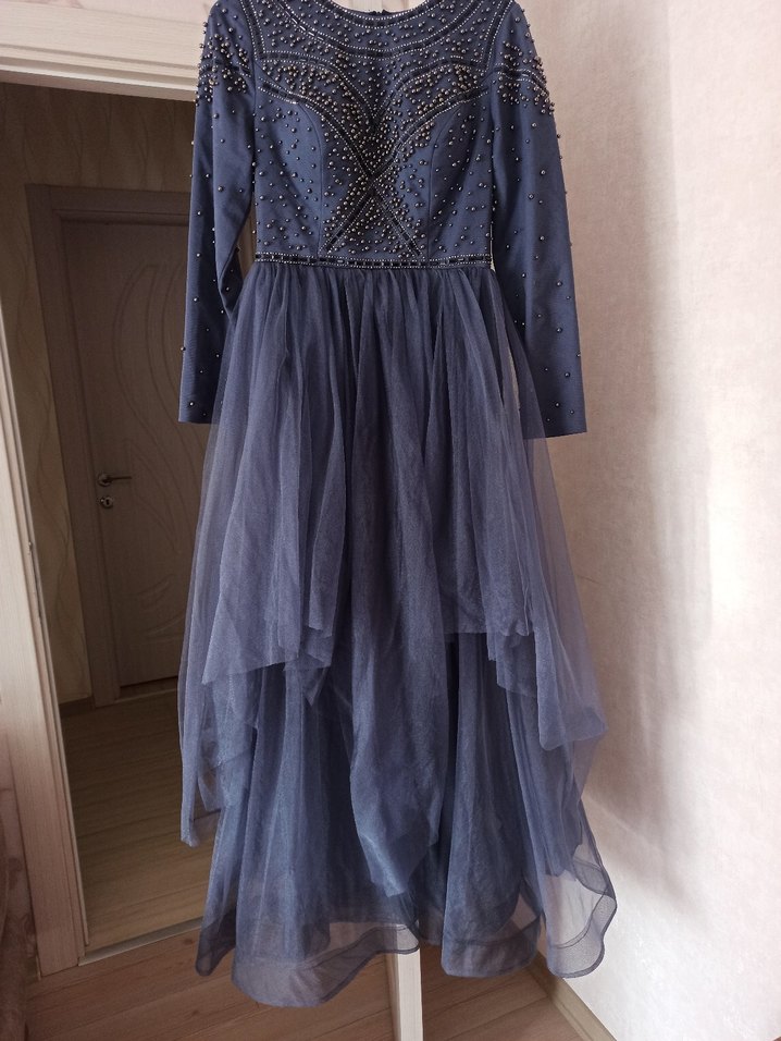 Uzun kollu, bol kesim lacivert abiye elbise, drapeli katmanlar ve boncuk işlemeleriyle avant-garde düğünler için uygun.Biri nişanımda olmak üzere sadece 2 defa giyildi.Temiz ve defosuzdur.