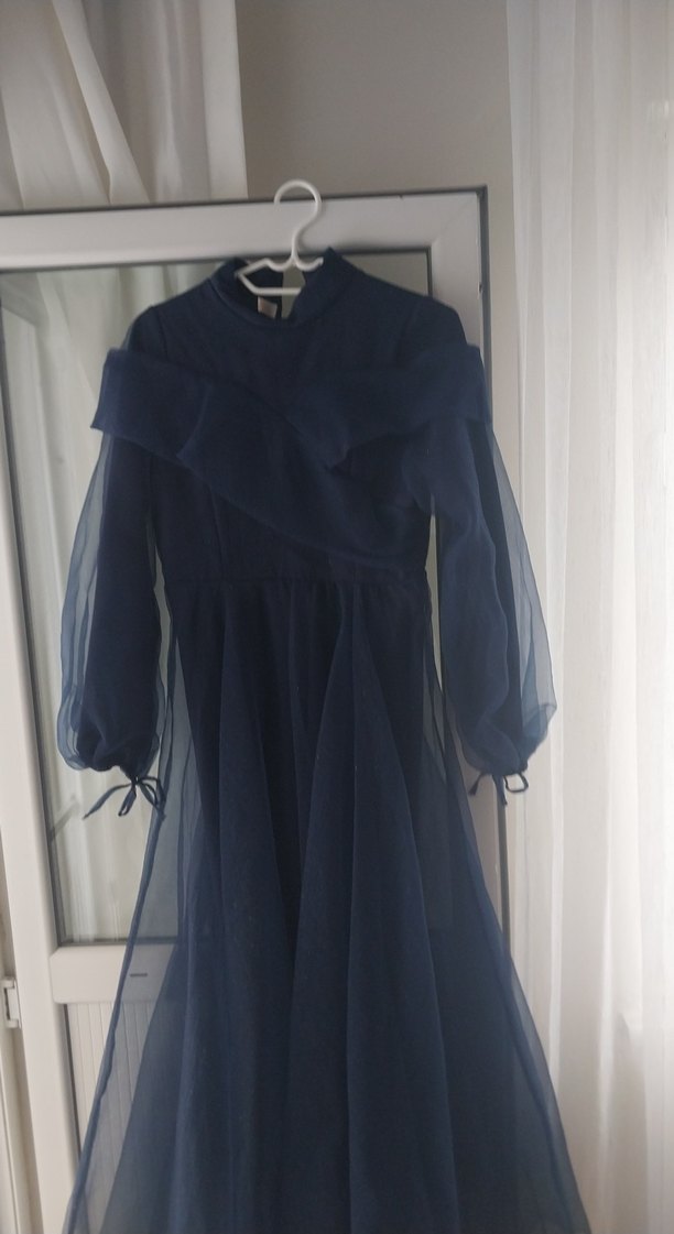 Lacivert uzun kollu abiye elbise, yüksek yakalı ve bol kesimdir. Drapeli detayları ve bağcıklı kollarıyla gotik ve şık bir görünüm sunar.