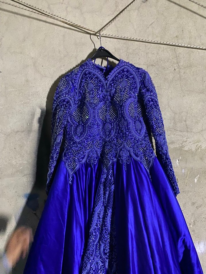 Bu uzun kollu, yüksek yakalı ve desenli detaylara sahip lacivert abiye elbise, klasik gotik tarzıyla düğünler için uygundur.