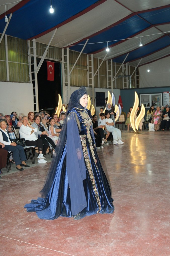 Drapeli, etnik desenli, uzun kollu ve yüksek yakalı, uzun lacivert gotik abiye, mütevazı düğünler için uygun.