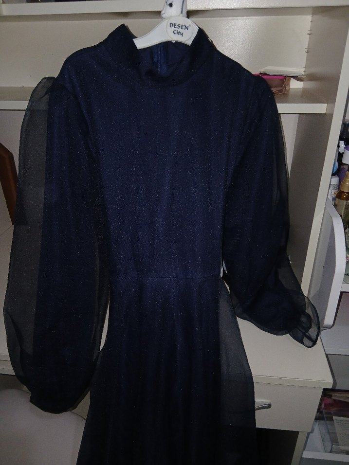 Yüksek yakalı, uzun kollu ve drapeli, lacivert renkte, gotik tarzda uzun elbise. Ofis için şık ve modaya uygun bir parça. ✨