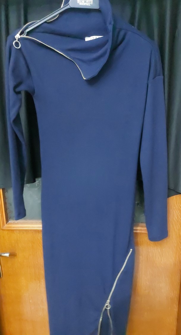 Fermuarlı, uzun kollu ve yüksek yakalı, yumuşak ve sıcak kumaştan yapılmış lacivert hamile tunik. Minimalist sokak stili ve ofis kullanımı için uygun.