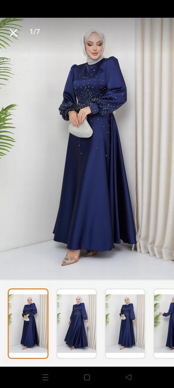 Uzun Kollu Lacivert İşlemeli Abiye Elbise