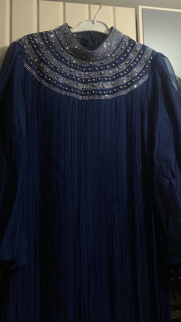 Uzun kollu, yüksek yakalı lacivert kadın abiyesi. Bol kesim, pileli ve parlak işlemeli detaylara sahiptir, düğünler için uygundur. ✨ Üst kısmı işlemeli taşlı