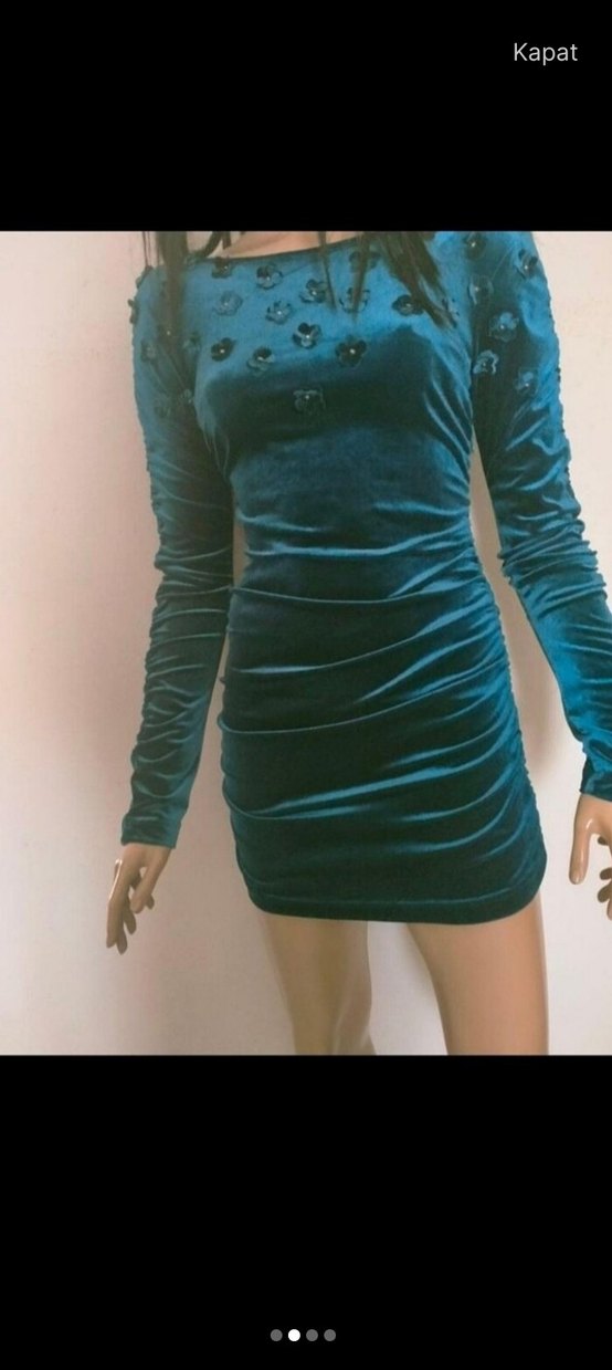 Lacivert kadife malzemeden, uzun kollu, yüksek yakalı ve drapeli tasarıma sahip, vücuda oturan mini elbise. Gotik ve göz alıcı tarzıyla romantik akşamlar için ideal.