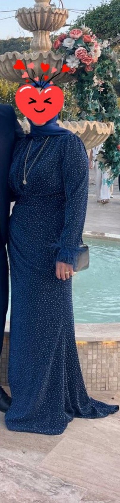 Uzun Kollu Lacivert Kadın Abiye Elbise