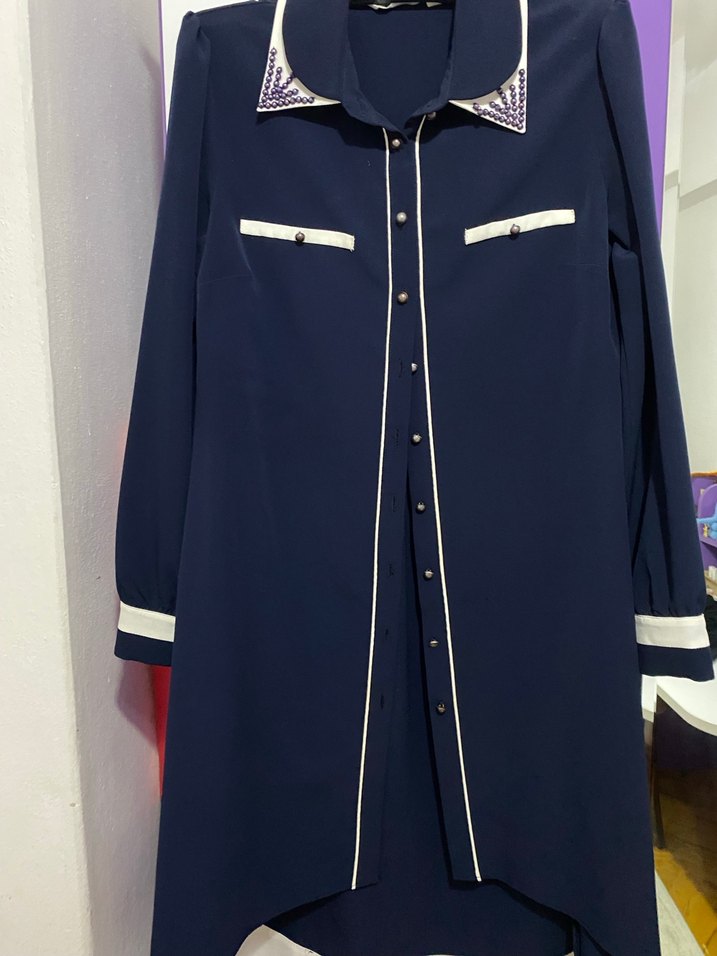 Uzun kollu, düğmeli, kesik yakalı lacivert kadın tunik. Sentetik kumaştan, iş ortamına uygun, rahat ve şık bir modeldir. Beyaz kuşağı ile gönderilecektir isteye bağlı kullanılabilir