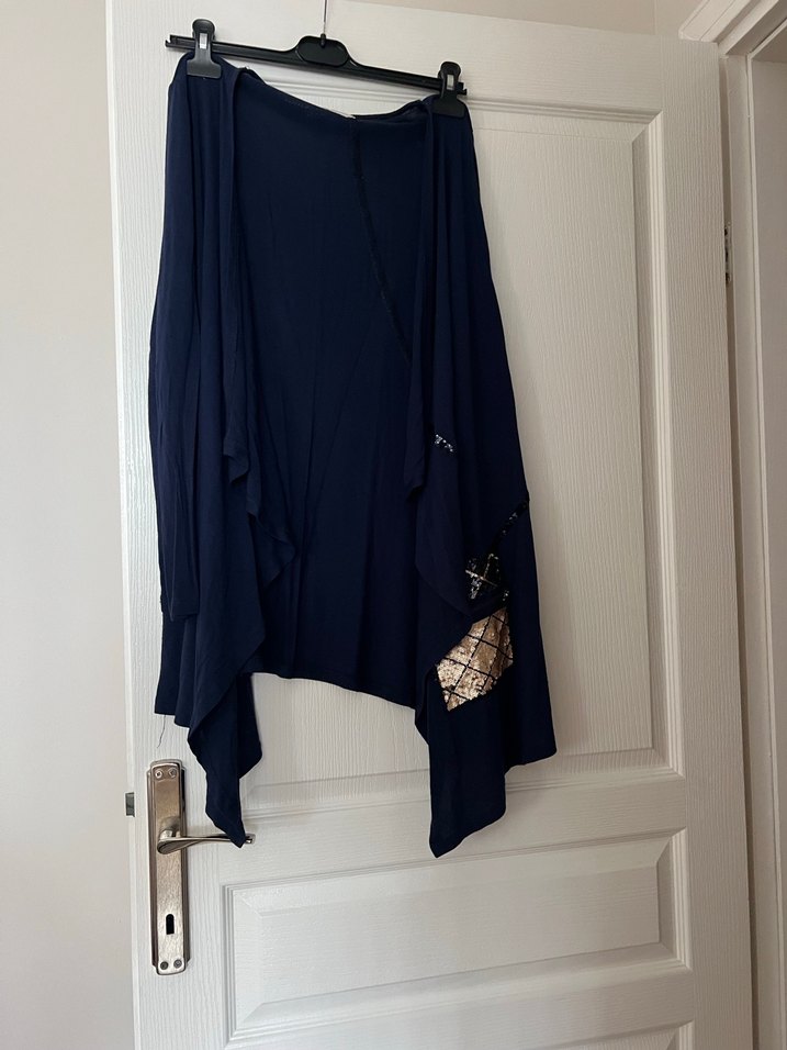 Uzun boy, bol kesim, yakalı lacivert kadın hırka. Dökümlü ve tekstil malzemeden, gotik tarzda, günlük kullanıma uygun.