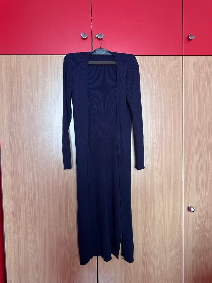 Uzun kollu, notched lapel yakalı ve yırtmaçlı lacivert kadın hırka. Sentetik kumaştan, regular fit ve gündelik kullanıma uygun.