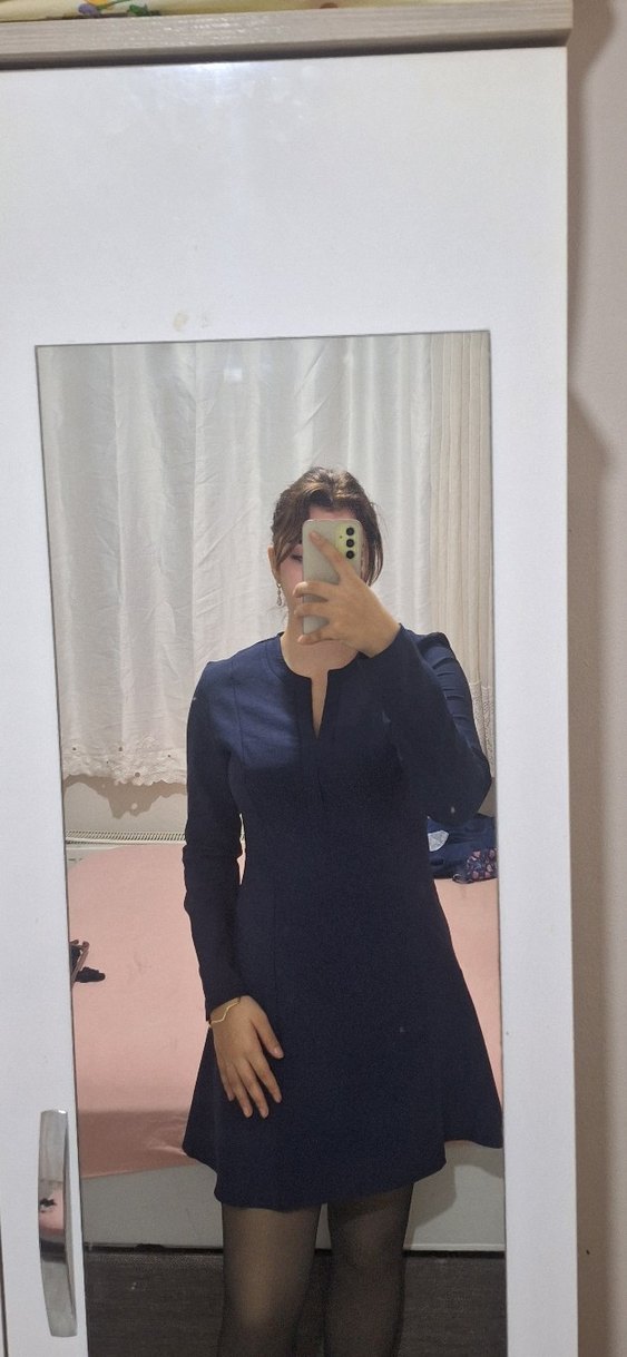 Uzun kollu ve yırtmaç detaylı, V yaka lacivert iş elbisesi. Regular kesim ve midi boyda, sentetik kumaştan üretilmiştir.