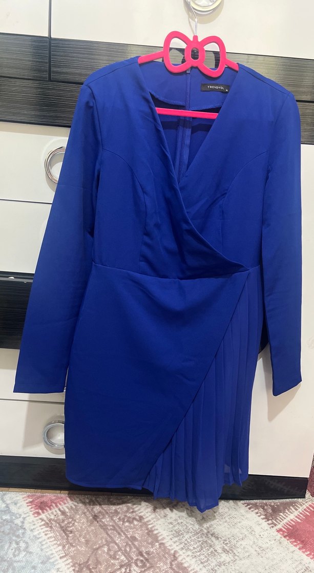Uzun kollu, yaka detaylı lacivert kadın ofis elbisesi. Pilili tasarımı ile şık ve rahat bir görünüm sunar. İş ve düğün ortamına uygundur.