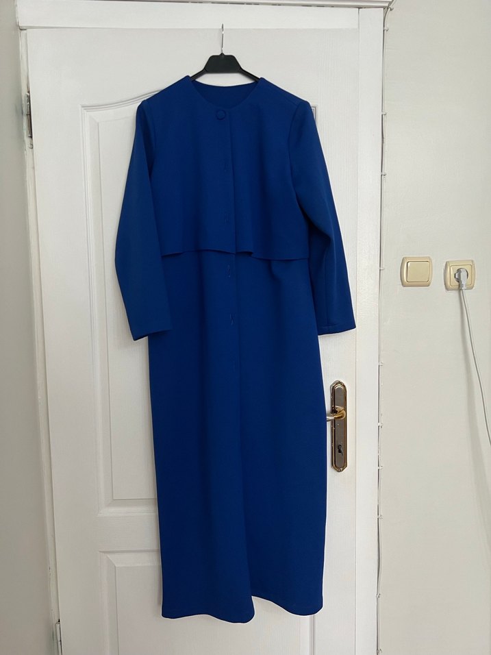 Uzun kollu, lacivert renkte, notalı yaka ve drapeli tasarıma sahip pardesü.