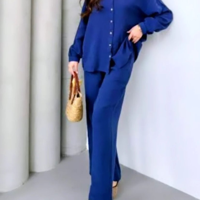 Lacivert, uzun kollu, ipeksi kumaştan kadın takım elbisesi. Notched yaka ve rahat kesimiyle günlük kullanıma uygun, zahmetsiz şıklık sunar.