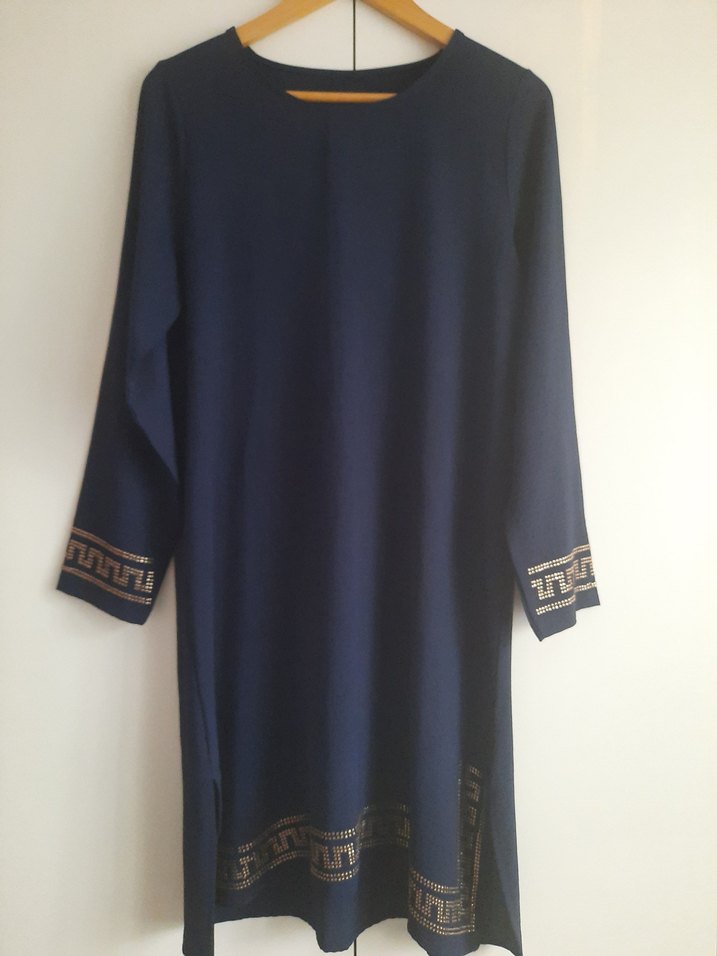 Uzun boy, bol kesim, uzun kollu ve yuvarlak yakalı kadın tunik. İpeksi kumaştan, drapeli ve parlak lacivert renkte, manşet ve etek kısmında süslemeleri vardır.