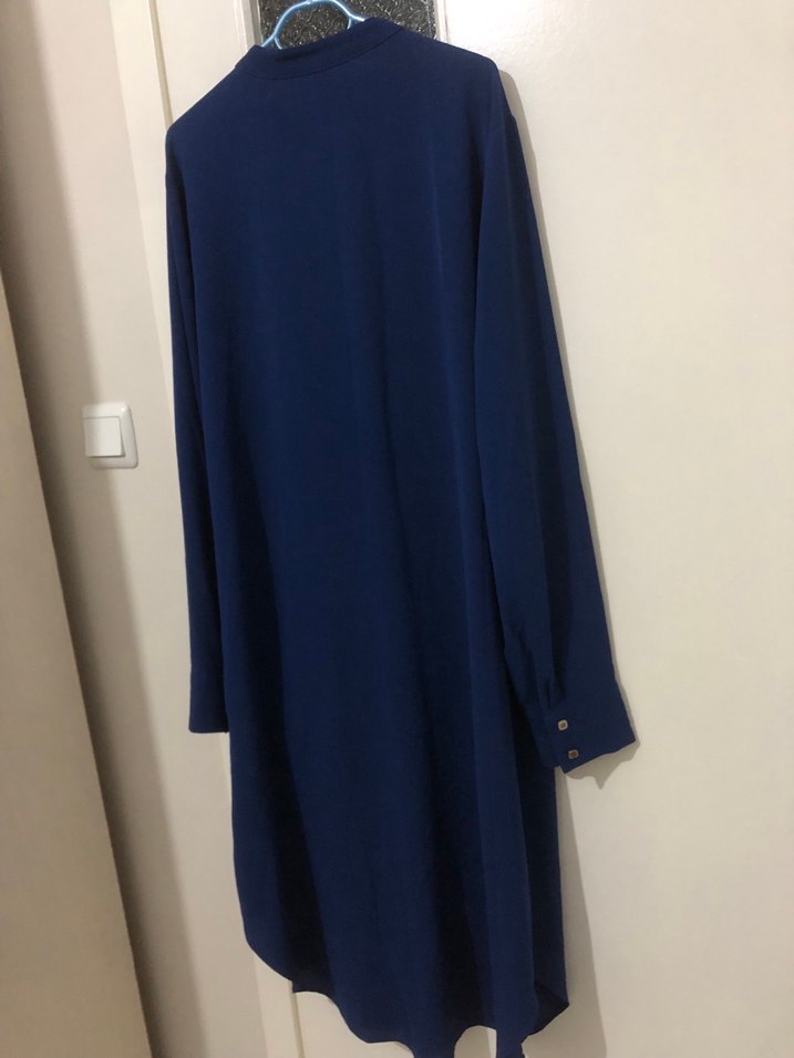Uzun kollu, yüksek yakalı lacivert kadın tunik. İpek gibi kumaştan, bol ve drapeli kesime sahip, minimal desensiz tasarım.